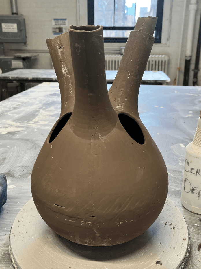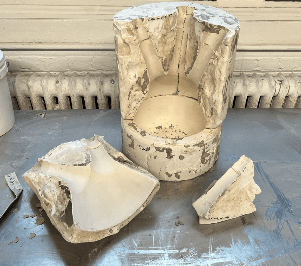 If this project was to be mass produced multiple molds would be made but for the final model of this project one large five part mold was made out of plaster. The final mold had a 10 inches wide diameter and was 14 inches tall. Ten pieces were slipcasted but only eight of them made it to the final baking phase in the kiln as two of them were lost during the making process.