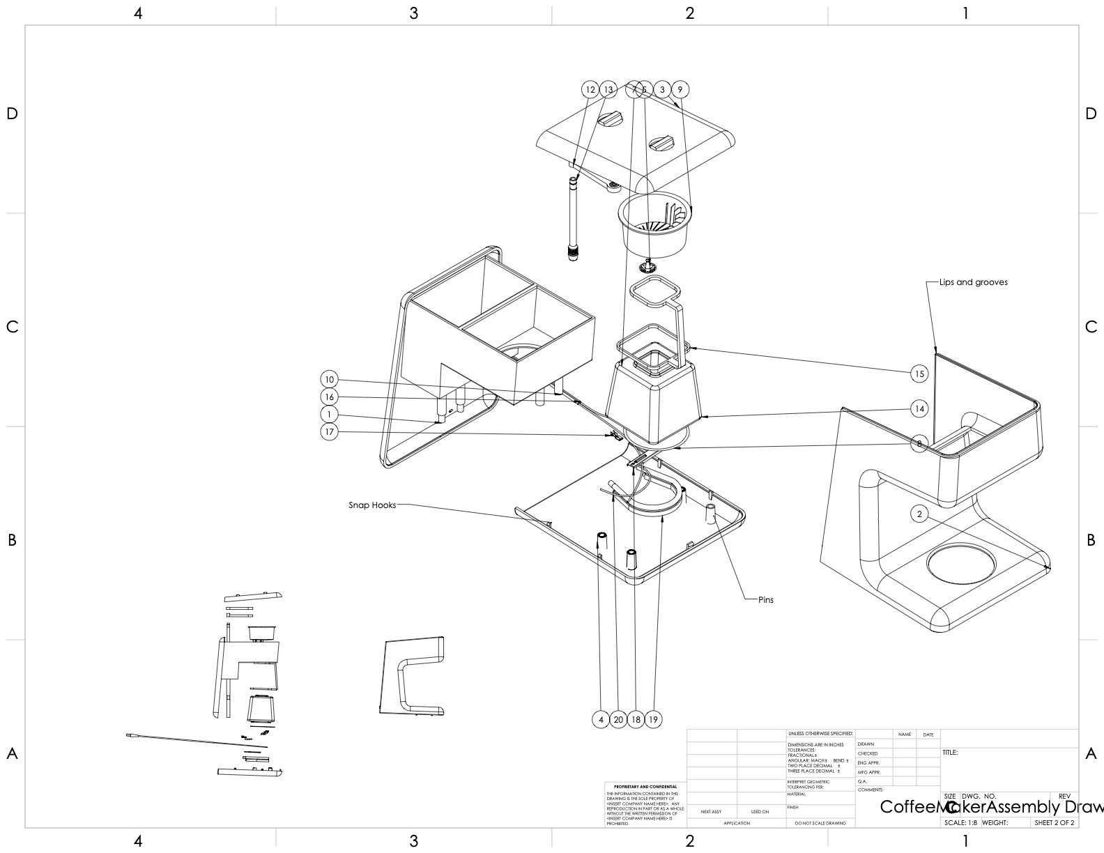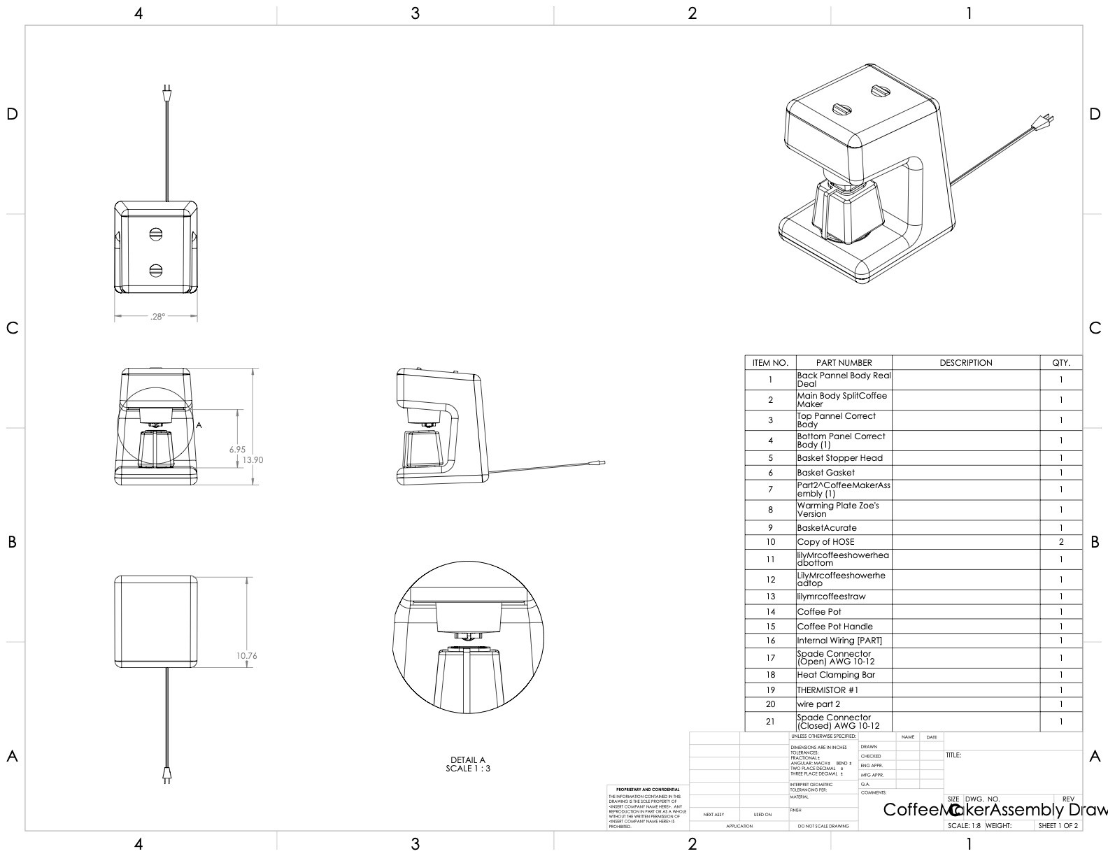 For this project, we took a standard coffee maker and deconstructed it and then modeled all the parts in solid works. We were allowed to design our own housing for the machine however all the necessary internal components had to be there.
