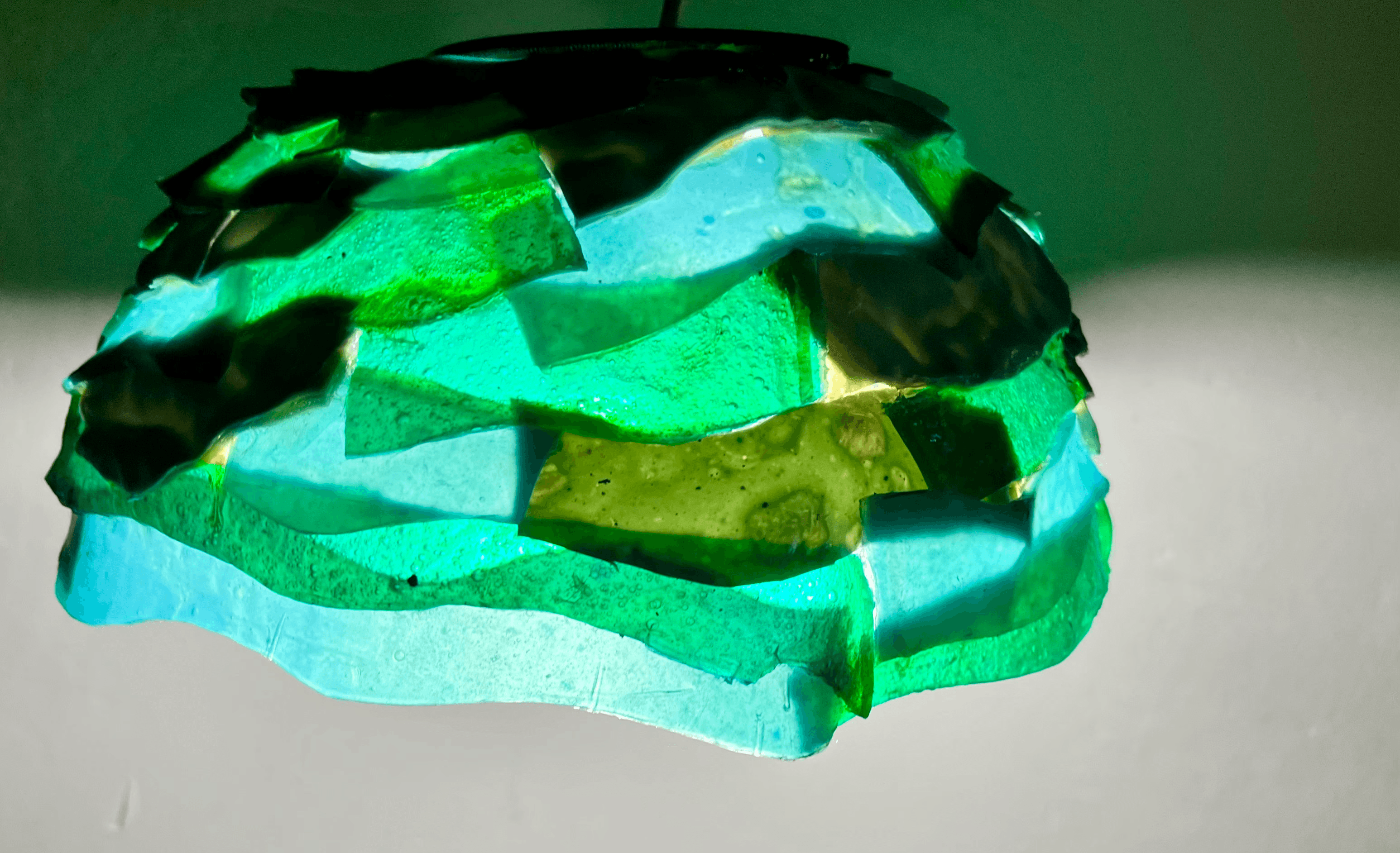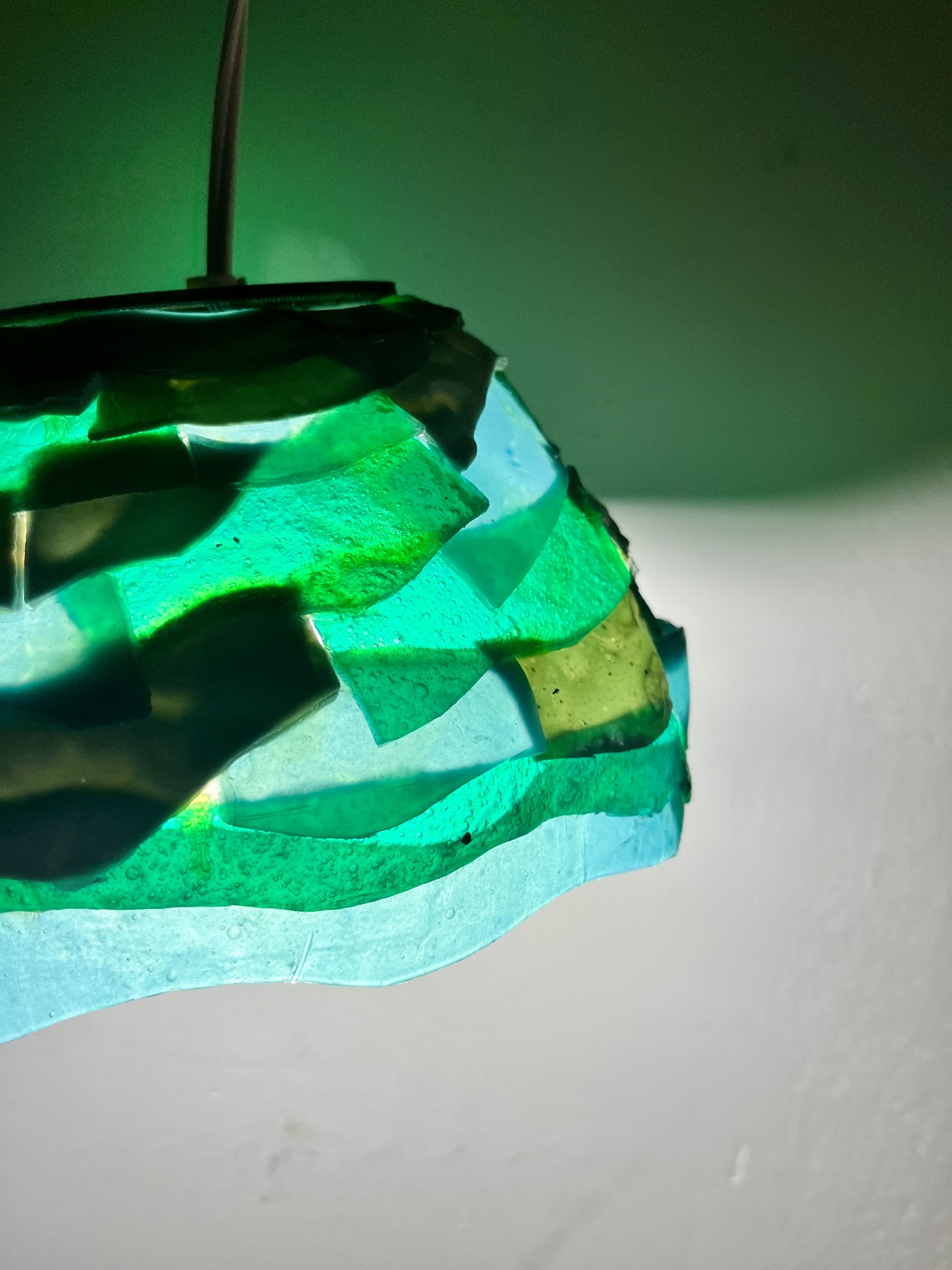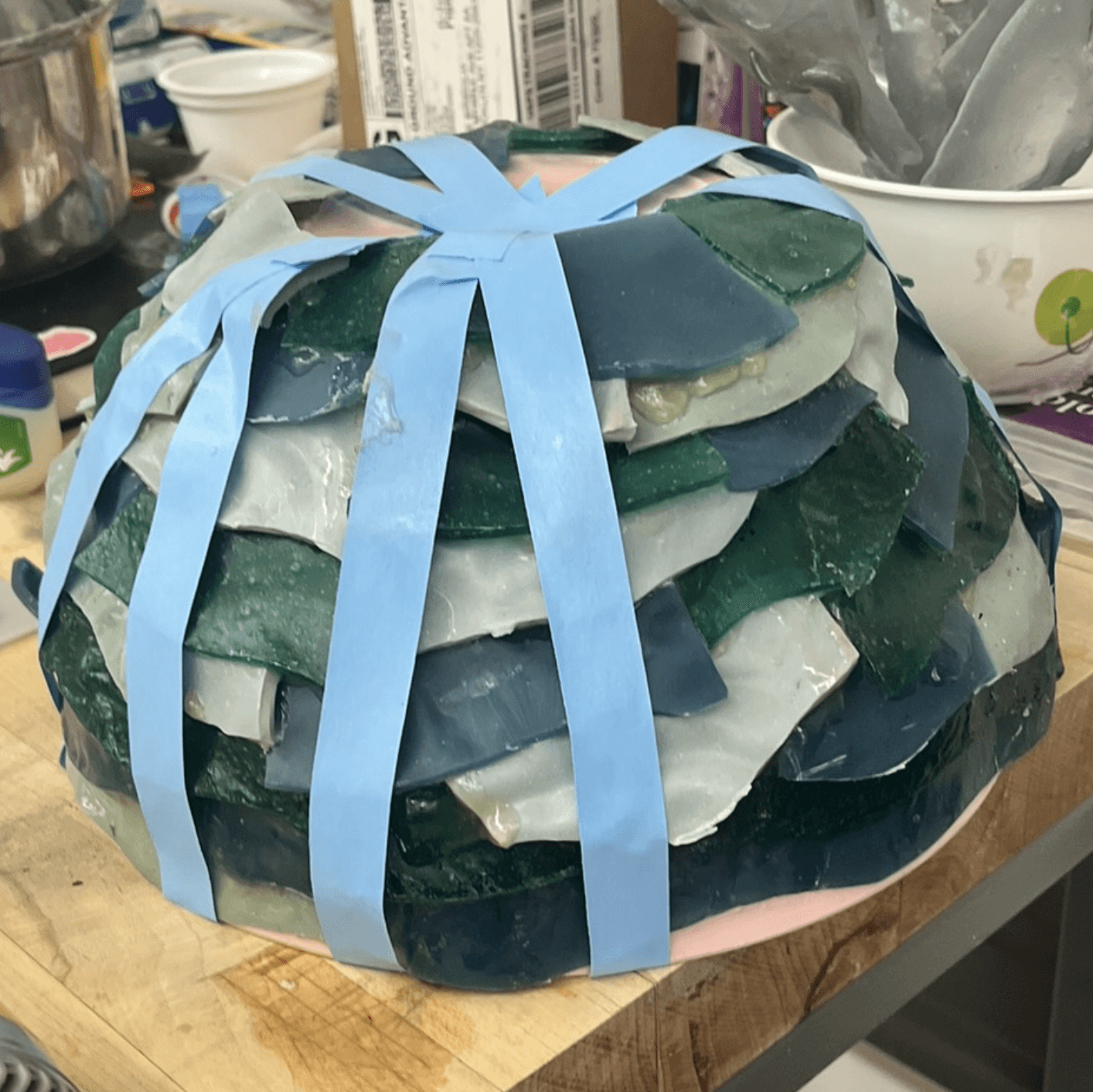 To do this, several different sheets of bioplastic were made in different colors which had varying opacities and then cut them into strips. The strips were then around a bowl and used uncolored bioplastic as glue to stick them together.