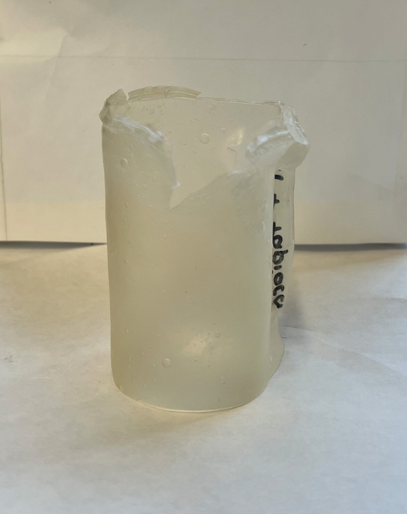 The material proved to be moldable when rewetted as well as having a decent tensile strength. Clamps were left dangling from the material for 48 hours and no tearing or other damage was shown.