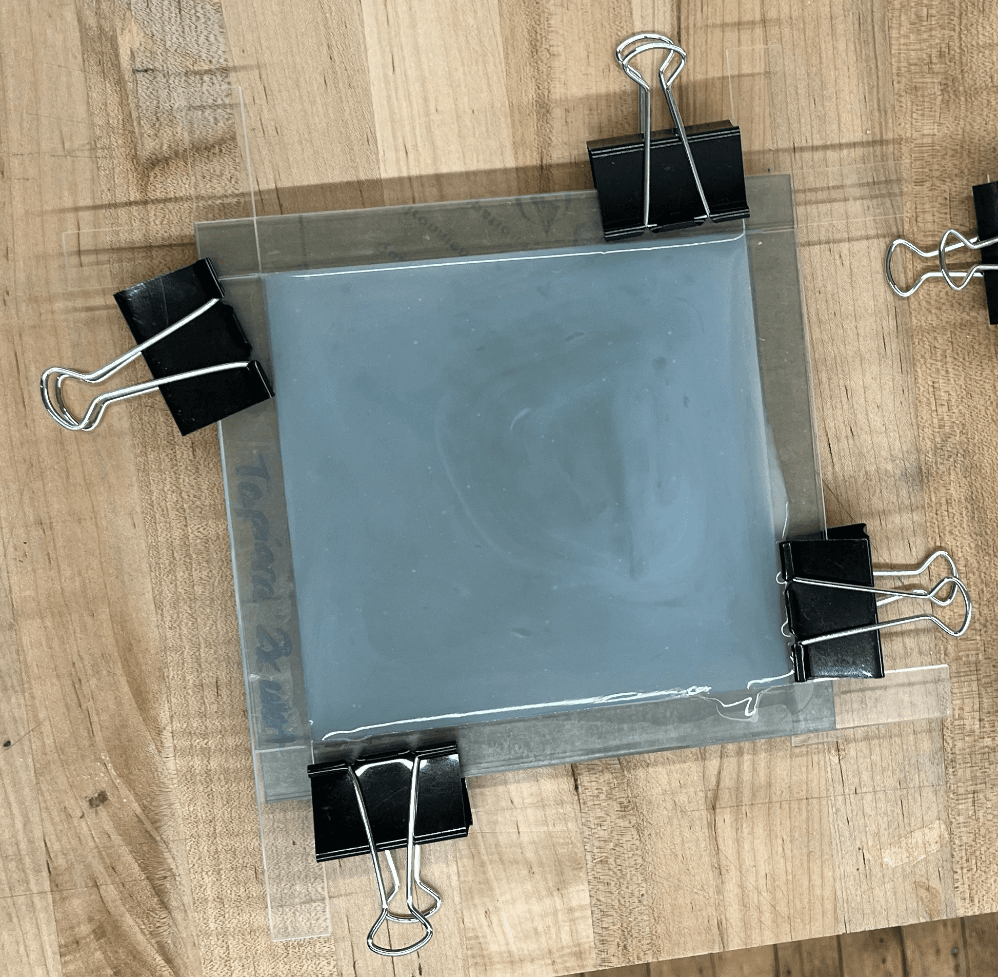 Hot bioplastic liquid was poured into a thin sheet mold that dried as it cooled. After 48 hours a mostly flat thin sheet of bioplastic was be formed. After a week it still looked the same with no warpage.